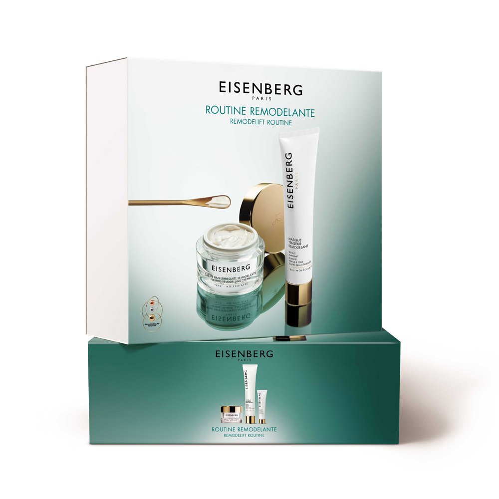 Jedes Produkt im EISENBERG Routine Remodelift Set präsentiert sich in einer eleganten und durchdachten Verpackung, die Funktionalität und Ästhetik vereint. Die Crème Raffermissante Remodelante kommt in einem luxuriös anmutenden Tiegel, der mit seinem klaren Glas und dem goldfarbenen Deckel ein Gefühl von Exklusivität vermittelt. Der Masque Tenseur Remodelant liegt in einer schlanken Tube, die durch ihre klare Linienführung besticht und einfach zu handhaben ist. Der Soin Cou, Décolleté et Poitrine präsentiert sich in einer handlichen, kompakten Tube, die leicht zu transportieren ist und dennoch den hochwertigen Anspruch des Sets unterstreicht. Gemeinsam bilden sie ein harmonisches Ensemble, das sowohl Pflege als auch optischen Genuss bietet.