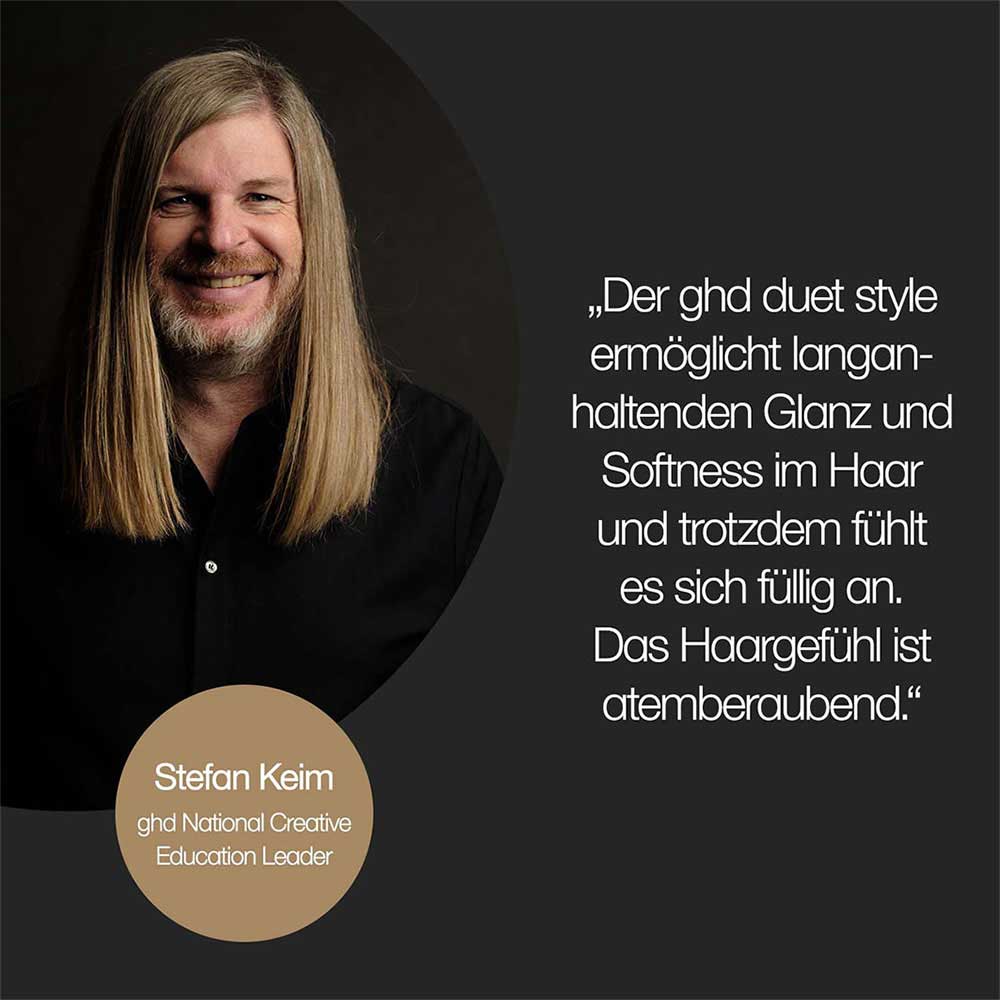 Der ghd duet style präsentiert sich in einem eleganten, modernen Design. Die geschwungene Form und die klaren Linien der Stylingkammer schaffen nicht nur eine ansprechende Optik, sondern gewährleisten auch eine komfortable Handhabung. Die Platten sind mit einer Ultra-Glanz-Beschichtung versehen, die für ein sanftes Gleiten sorgt. Das 2,7 Meter lange Kabel bietet Flexibilität und Bewegungsfreiheit beim Stylen. Eine Plattenschutzkappe ergänzt das durchdachte Design, indem sie das Gerät sicher und kompakt hält, wenn es nicht in Gebrauch ist. Zwei Jahre Herstellergarantie unterstreichen die Qualität und Langlebigkeit dieses innovativen Stylers.