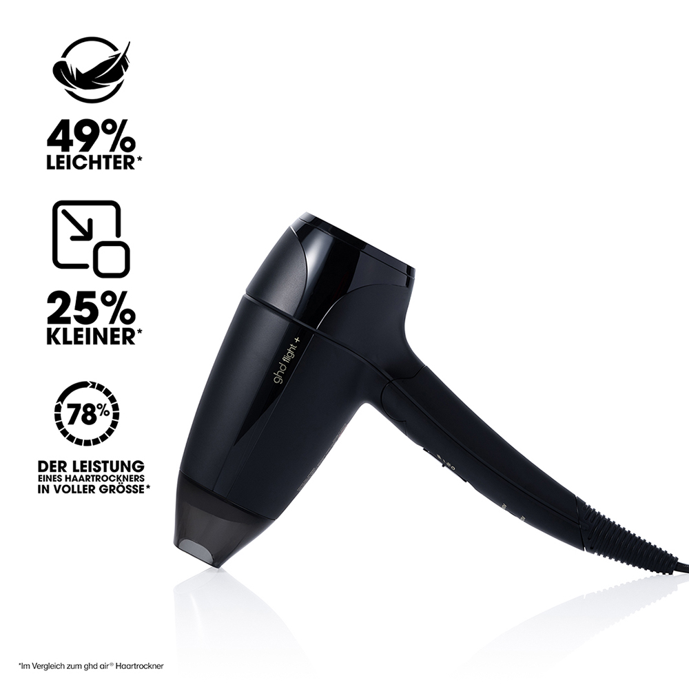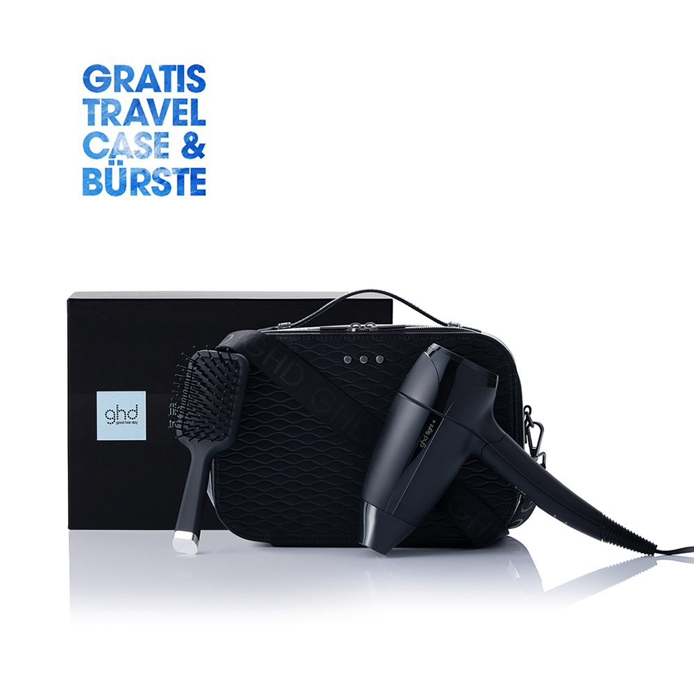 Mit dem ghd flight+® Geschenkset tragen Sie den Zauber eines good hair days auf all Ihren Reisen in der Hand. Der kompakte ghd flight+® Haartrockner, ausgestattet mit einem kraftvollen 1600W-Motor, bietet Ihnen die Möglichkeit, überall ein perfektes Blow-Dry zu erzielen. Trotz seiner geringen Größe liefert dieser Reisehaartrockner 78% der Leistung eines herkömmlichen Modells und sorgt dank Ionen-Technologie für weniger Frizz und mehr Glanz. Durch den einklappbaren Griff und das um 25% kleinere, 49% leichtere Design ist er der ideale Reisebegleiter. Zwei Geschwindigkeits- und Temperaturstufen bieten Ihnen die Flexibilität, Ihr Styling nach Ihren Wünschen zu gestalten, während die abnehmbare Düse für Präzision sorgt. Die integrierte Dual-Spannung und das 1,8m lange Kabel garantieren Komfort und Benutzerfreundlichkeit weltweit.