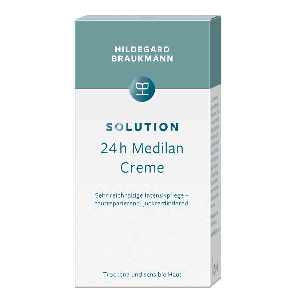 Die Hildegard Braukmann 24H Medilan Creme ist eine wohltuende Intensivpflege für trockene und strapazierte Haut. Mit ihrer reichhaltigen Formel lindert sie effektiv Juckreiz und repariert die Haut sichtbar. Die Kombination aus medizinischem Lanolin, bekannt als Medilan, und wertvollen Extrakten der Ballonrebe fördert die Hautglättung und Beruhigung. Diese Creme ergänzt fehlende Hautlipide und speichert nachhaltig Feuchtigkeit, wodurch die Regeneration der Haut optimal unterstützt wird. Besonders geeignet für trockene Ekzeme, Neurodermitis und Psoriasis, bietet sie eine beruhigende Wohltat ohne synthetische Konservierungsmittel. Die pflanzlichen Duftstoffe tragen zusätzlich zu einem angenehmen Pflegeerlebnis bei.