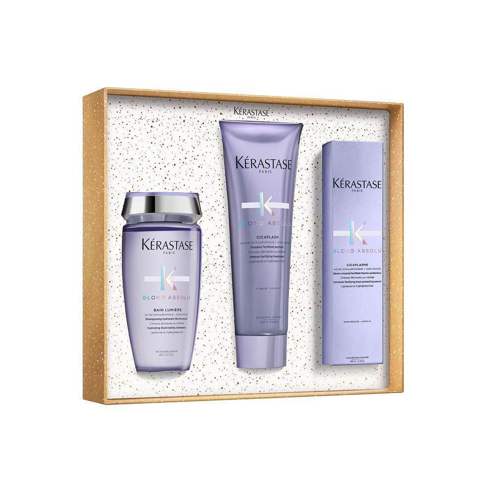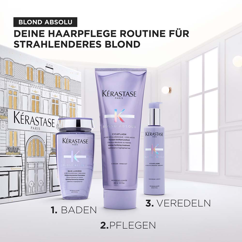 Blond Absolu Light Set - Das neutralisierende Bain Lumière reinigt das Haar, Cicaflash baut das Haar wieder auf und das reparierende Cicaplasme pflegt es tiefenwirksam und bietet Hitzeschutz. Sorgt für gesünderes und gekräftigtes Haar. Für ein strahlendes Blond, ohne Kompromisse.