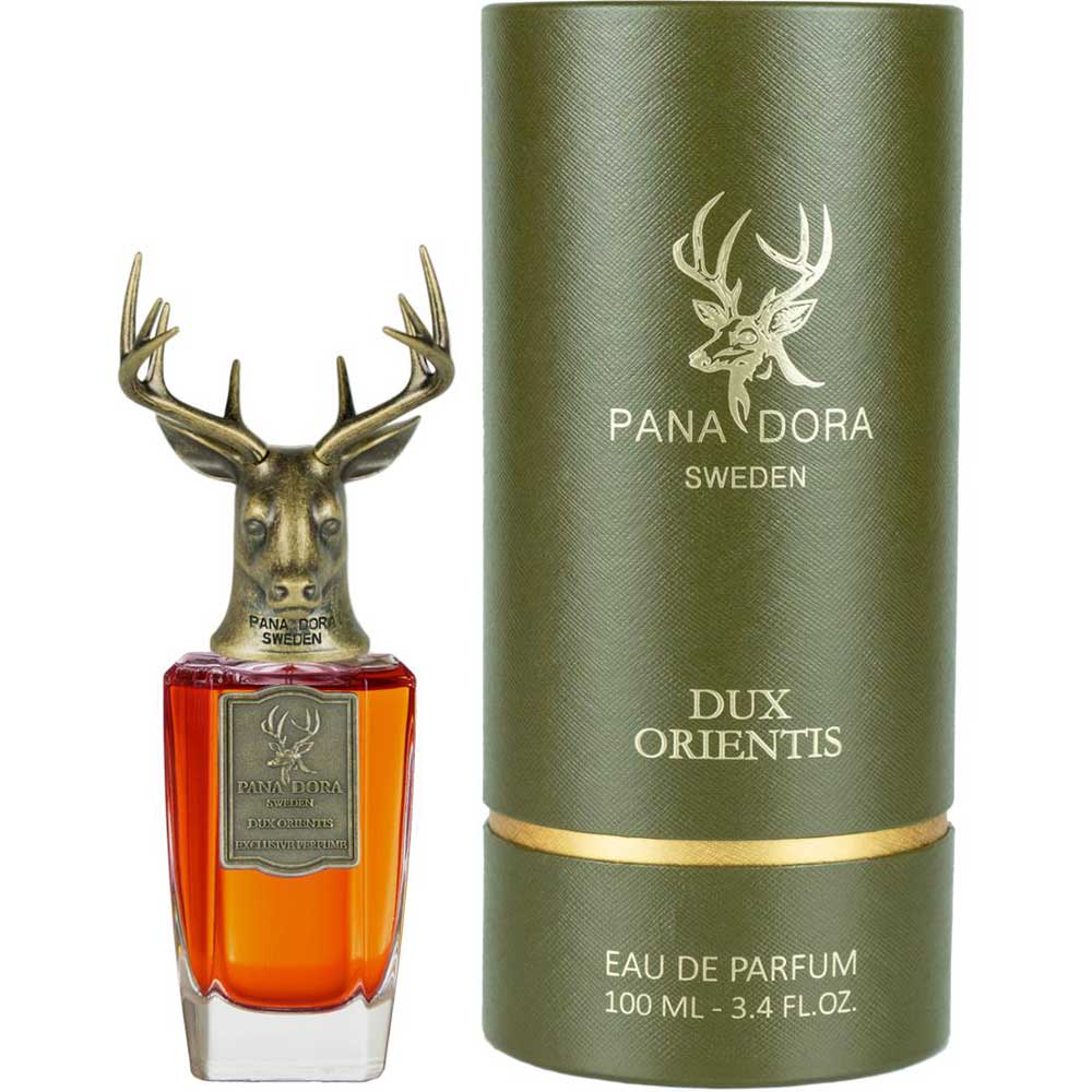 Das Design des Flakons spiegelt die majestätische Aura des Inhalts wider. Gekrönt von einer kunstvoll gestalteten, goldfarbenen Hirschskulptur, wirkt der Flakon wie ein Artefakt aus einer längst vergangenen Epoche. Der Körper des Flakons zeigt sich in einem warmen Bernsteinton, der das Licht auf faszinierende Weise einfängt und die Tiefe und Komplexität des Duftes symbolisiert. Die klare Glasstruktur verleiht dem Flakon eine elegante Schlichtheit, während die markante Metallplakette mit der Aufschrift "Pana Dora Sweden" das Design stilsicher abrundet. Dieses Zusammenspiel aus Form und Material schafft ein visuelles Erlebnis, das die Geschichte und den Geist des Parfums eindrucksvoll widerspiegelt.